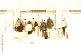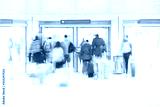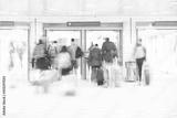 Travellers in blurred motion crowding to get through door at railway station or airport