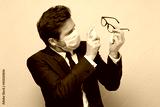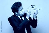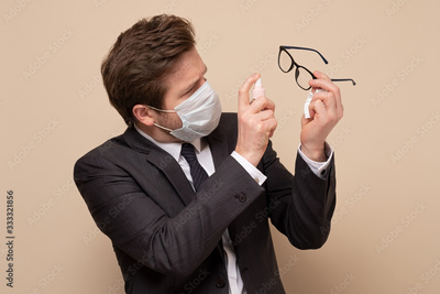 Man in medical mask wearing suit disinfecting the glasses.