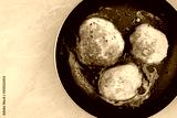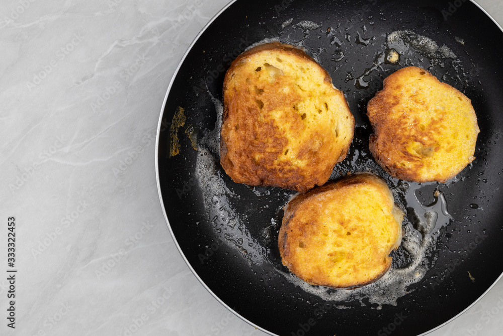 Flatlay above french toast served with dishcloth and kitchen utensils on the table