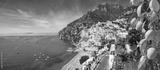 Panoramic view of Positano with comfortable beaches and blue sea on Amalfi Coast in Campania, Italy. Amalfi coast is popular travel and holyday destination in Europe.