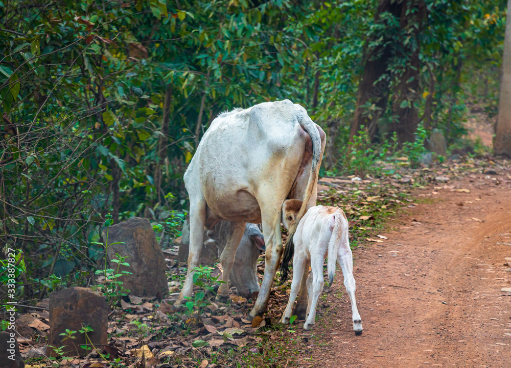 A Calf Cow with his mother, drinking milk. Selective Focus is used.