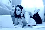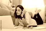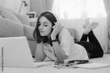 young girl teenage schoolgirl sits floor living room sofa student studying home working with her laptop doing homework