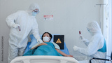 coronavirus covid 19 treatment background of coronavirus covid 19 patient on bed with doctors in PPE coverall suit in hospital negative pressure quarantine room, coronavirus covid 19 disease treatment