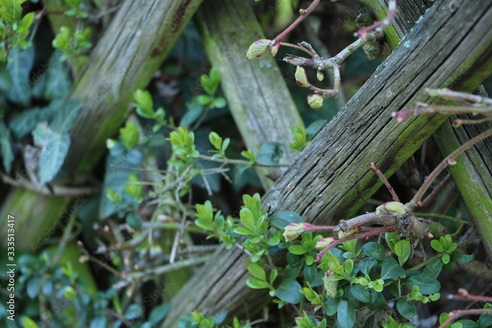 blühende Holzzäune, Gartenmauer, Frühling, Natur