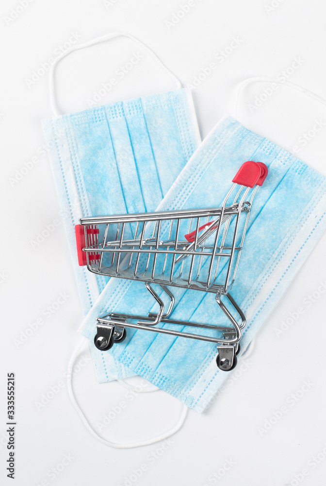 Medical mask in shop trolley on white background. Sale of medical masks. Coronavirus concept. 2019 nCoV.