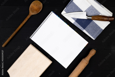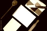 Kitchen wooden utensils with knife above black table background and black copy space papers