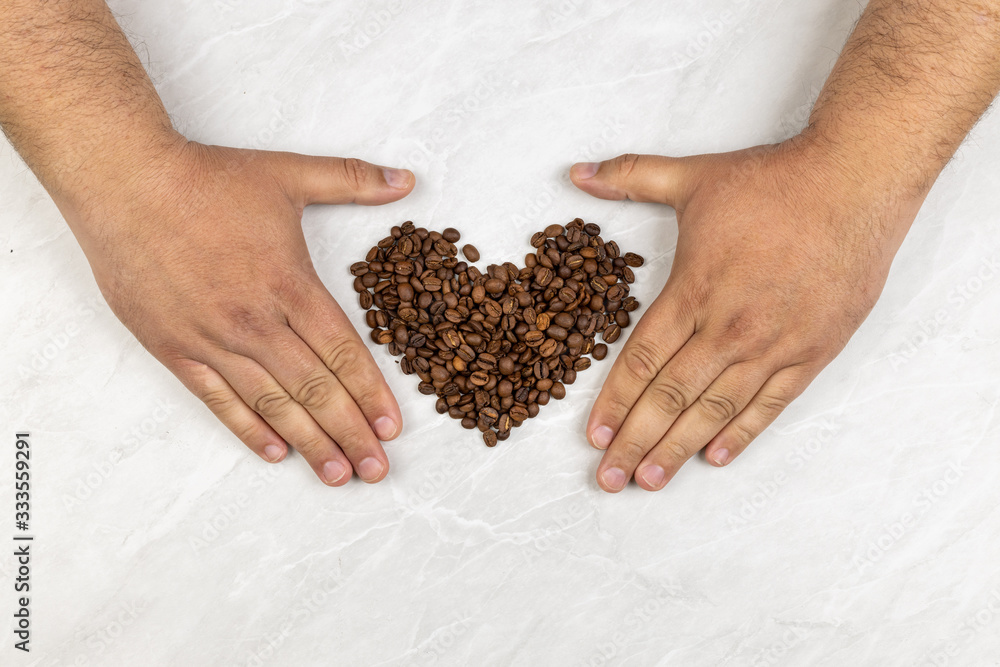 Coffee beans in heart shape on the grey marble table with copy space