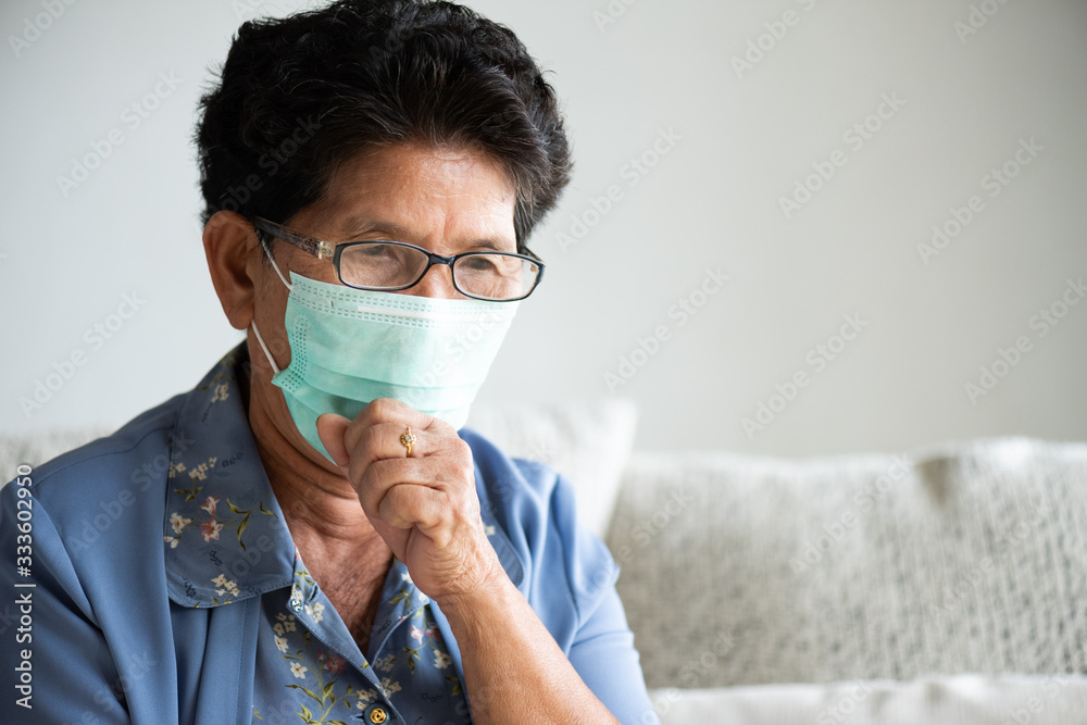 Sick asian old woman wearing Protective face mask, get ready for Coronavirus and pm 2.5 fighting, sitting on sofa at home. Senior healthcare concept.