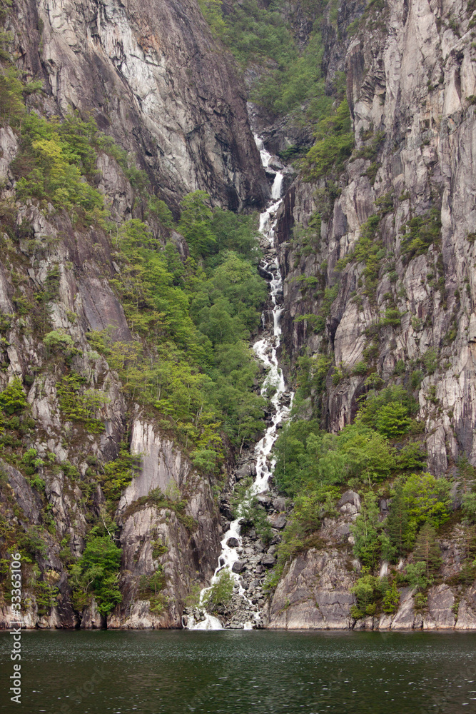 Waterfall on the bank of Lysefjorden in Norway, Europe