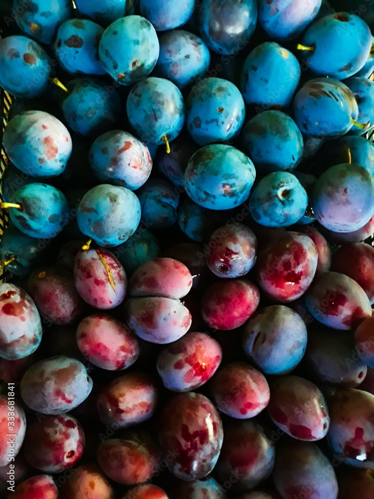 Two different plum cultivars, plum in a plastic basket