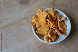 Small bowl of chanterelle mushrooms, seasonal gourmet food ingredient, copy space, horizontal aspect
