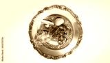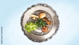 Pesach plate, on a light blue background. Traditional Jewish seder on the occasion of Passover festival.