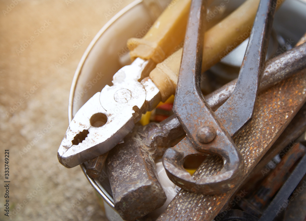 Old construction tools lie on the concrete surface. A set of old tools and a drill.
