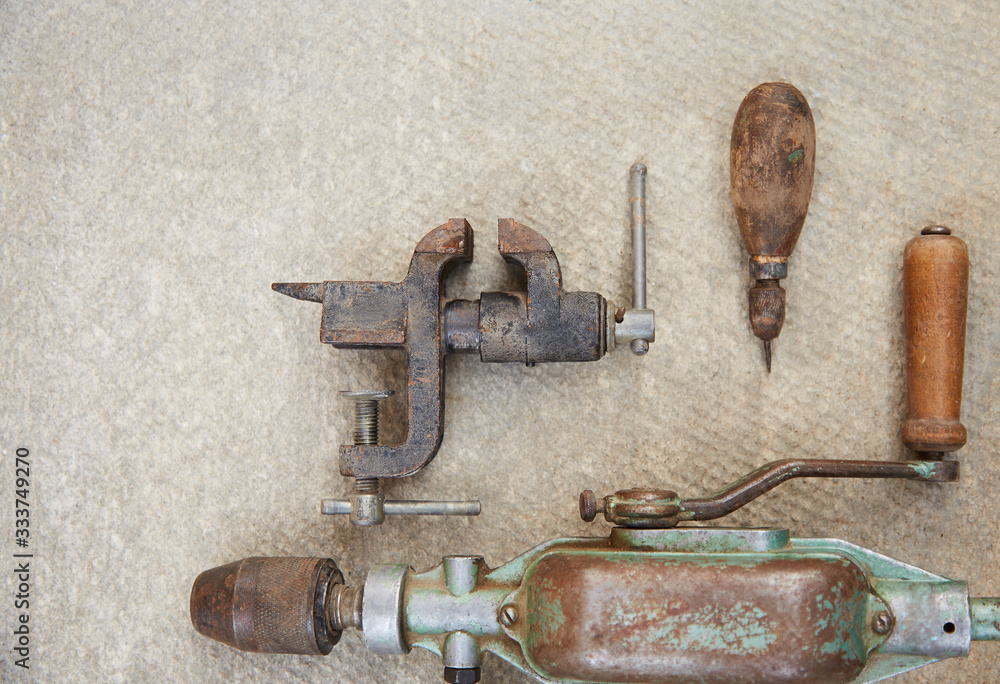 Old construction tools lie on the concrete surface. A set of old tools and a drill.