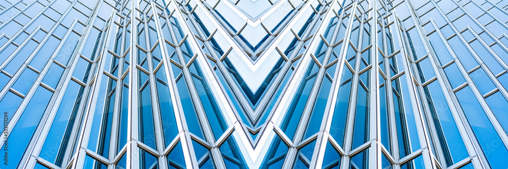 underside panoramic and perspective view to steel blue glass high rise building skyscrapers, business concept of successful industrial architecture