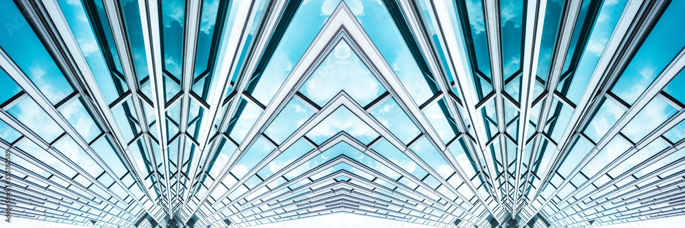 underside panoramic and perspective view to steel blue glass high rise building skyscrapers, business concept of successful industrial architecture
