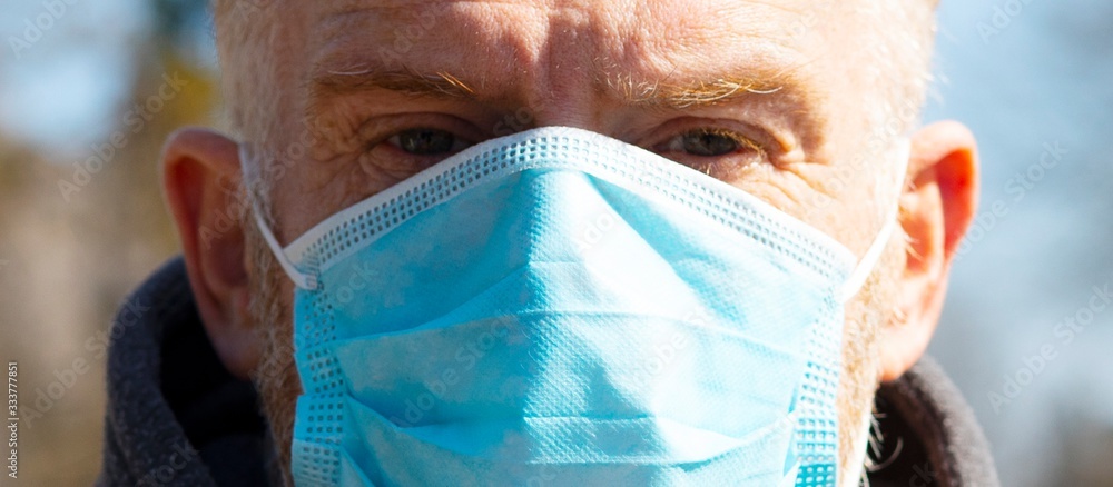 Close-up of a man in a surgical mask standing outdoor. Virus infection protection kit. Rapidly spreading corona pandemic.