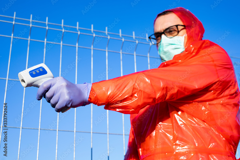 Man in protective suit, gloves and mask, checking body temperature with infrared forehead thermometer on a sunny day. Fighting coronavirus pandemic.