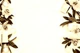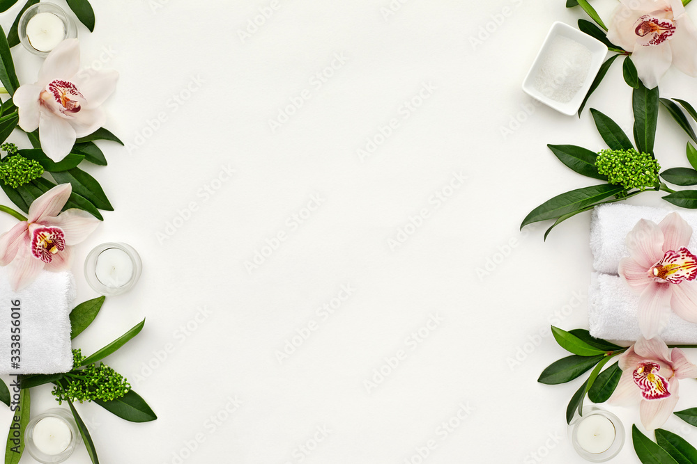 wellness and spa composition with towels, candle, tropical leaves and orchid flowers on white background. top view. copy space
