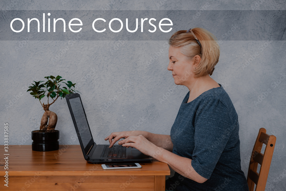 Portrait of a beautiful working serious business elderly woman with a laptop at her Desk on a gray blue background,