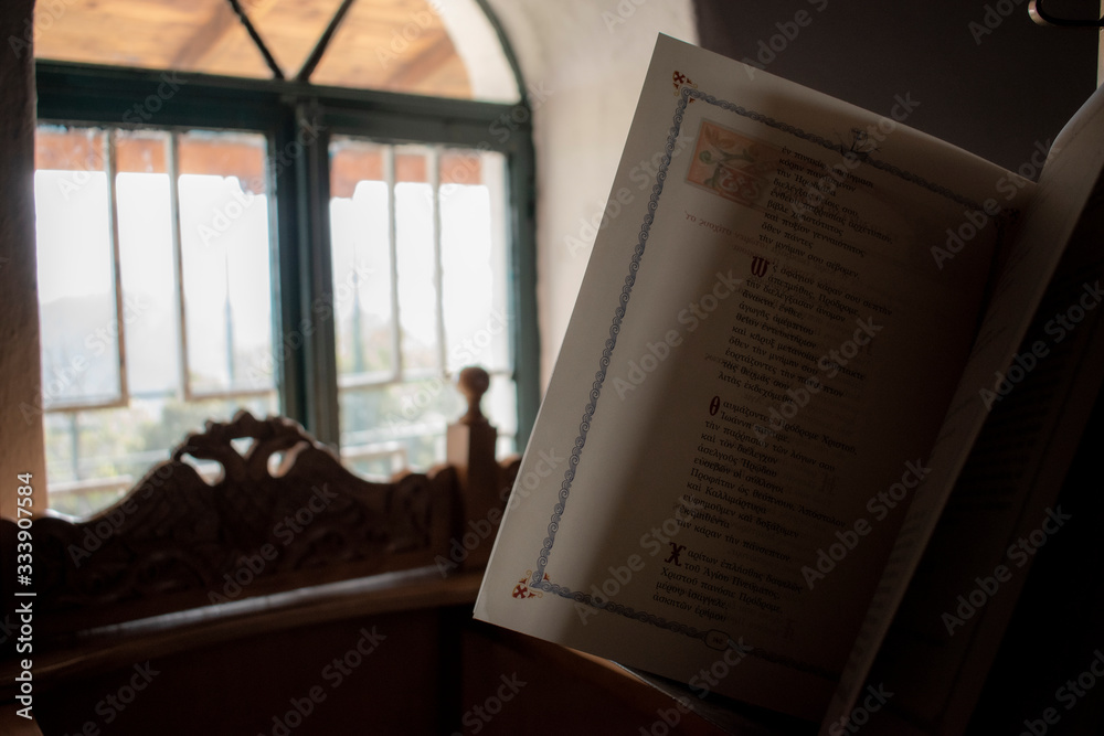 Christian Orthodox church interior. Open Holly Bible