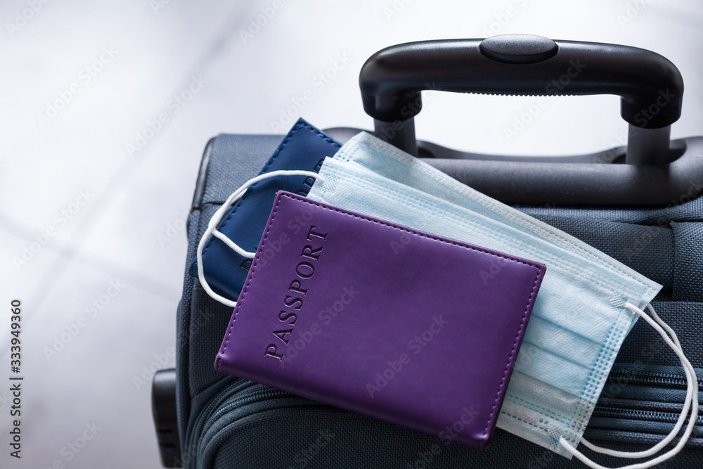 Travel suitcase, passport and medical mask. The ban on travel during the epidemic of the coronavirus and the introduction of quarantine concept.