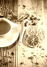 Fruit tea cup with cinnamon dried orange and berries, teacup