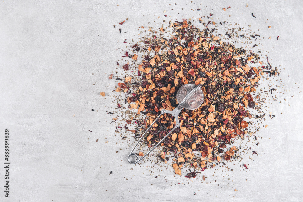 Fruit tea of dried flowers petals and dry berries with strainer or infuser - filter