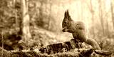 Cute red squirrel, sciurus vulgaris, eating a nut in green spring forest with copy space. Lovely wild animal with long ears and fluffy tail feeding in nature. Wide panoramic banner of mammal.