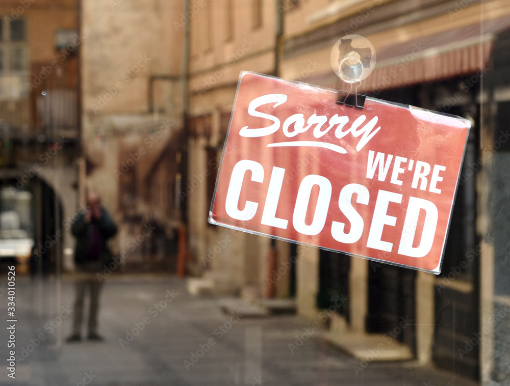 "Sorry we're closed" sign on the cafe door