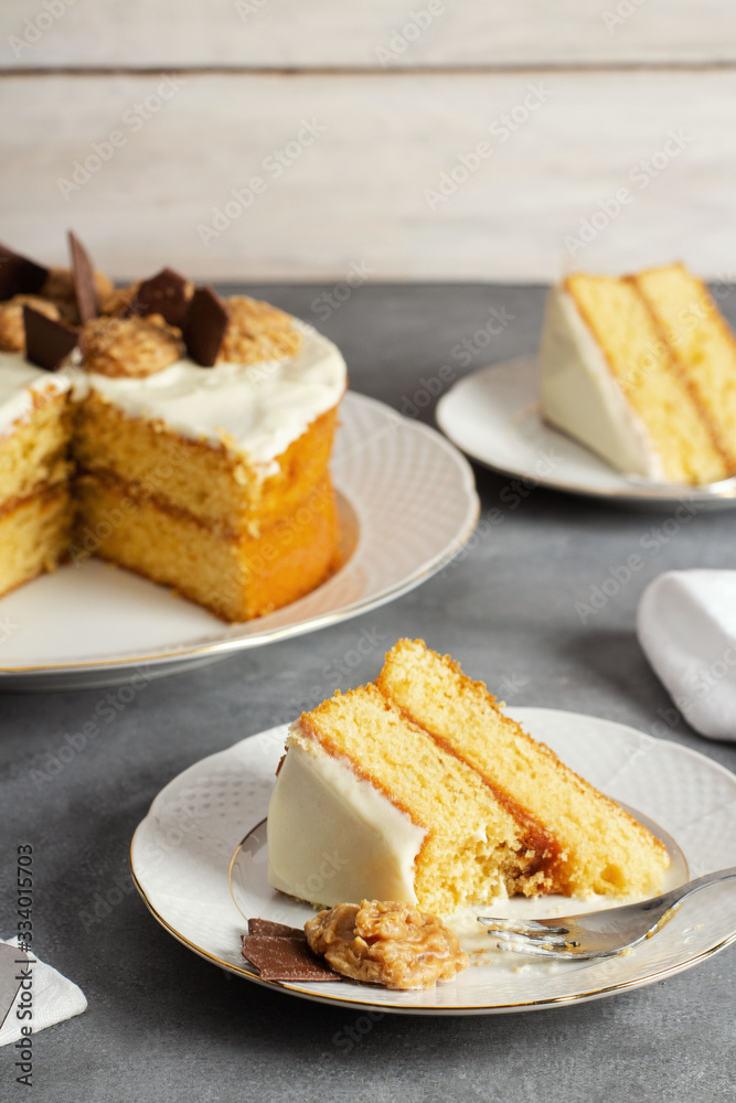 pastel de celebracion blanco con rebanada partida en la mesa para compartir