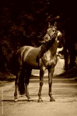 portrait of stunning chestnut showjumping budyonny stallion sport horse in bridle standing on road in forest in daytime