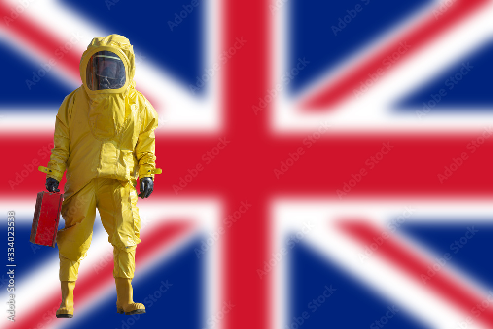 Isolated man with briefcase in yellow protective hazmat suit . Flag of United Kingdom in background. Epidemic virus.