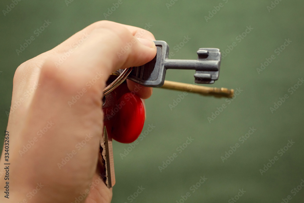 Vintage keys to the door lock in the hand of a man on a greenish background