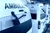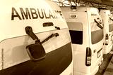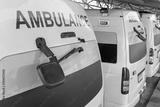 Back of ambulances standing in parking lot of hospital. A row of rescuers cars.