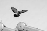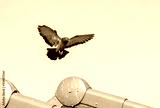 Flying dove is landing on red roof. A Pigeon flying in the blue sky.