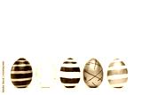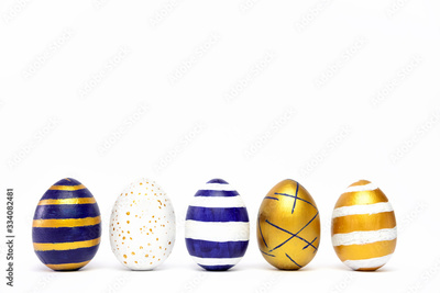 Five easter eggs trendy colored classic blue, white and golden decorated on white table. Happy Easter card with copy space for text. Minimal style.