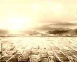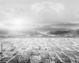 Unmanned floor tile square platform with rolling mountain landscape skyline.