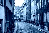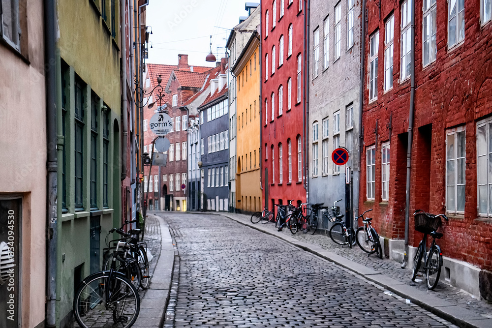 Ancient buildings on the narrow streets in historic center of Copenhagen, Denmark. February 2020