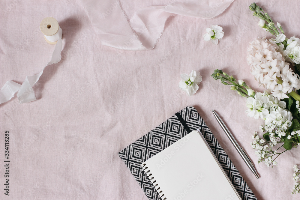 Spring, wedding stationery mockup scene. Bouquet of baby's breath Gypsophila, hyacinth and matthiola flowers on pink linen background. Blank gnotebook, silver pen. Flat lay, top view.