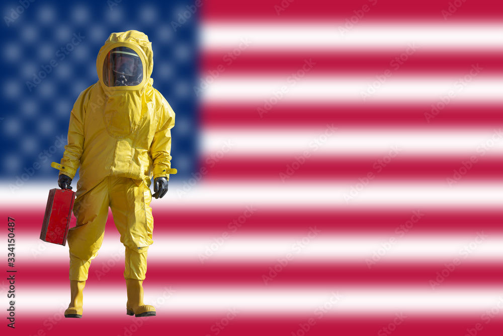 Isolated man with briefcase in yellow protective hazmat suit . Flag of United States of America in background. Epidemic virus.