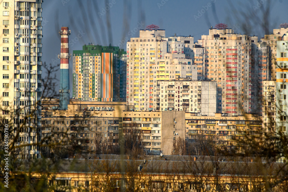 View to Kyiv district with high-rise multi-apartment buildings. Kyiv, Ukraine. March 2020