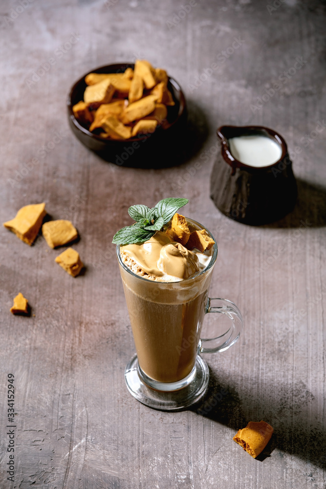 Dalgona frothy coffee trend korean drink latte espresso with coffee foam in tall glass, decorated by dalgona cinder toffee candy and mint. Grey concrete background.