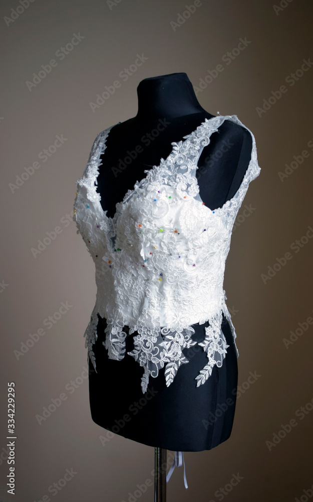 White wedding corset with pins on a black mannequin.