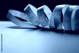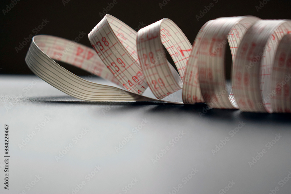 Twisted white centimeter with red numbers on a dark surface.