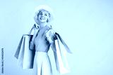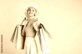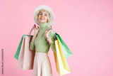 Spring shopping concept: happy smiling fashionable woman wearing trendy clothes posing with colorful paper bags. Pink background. Copy, empty space for text