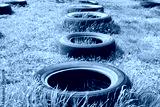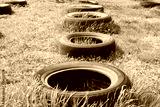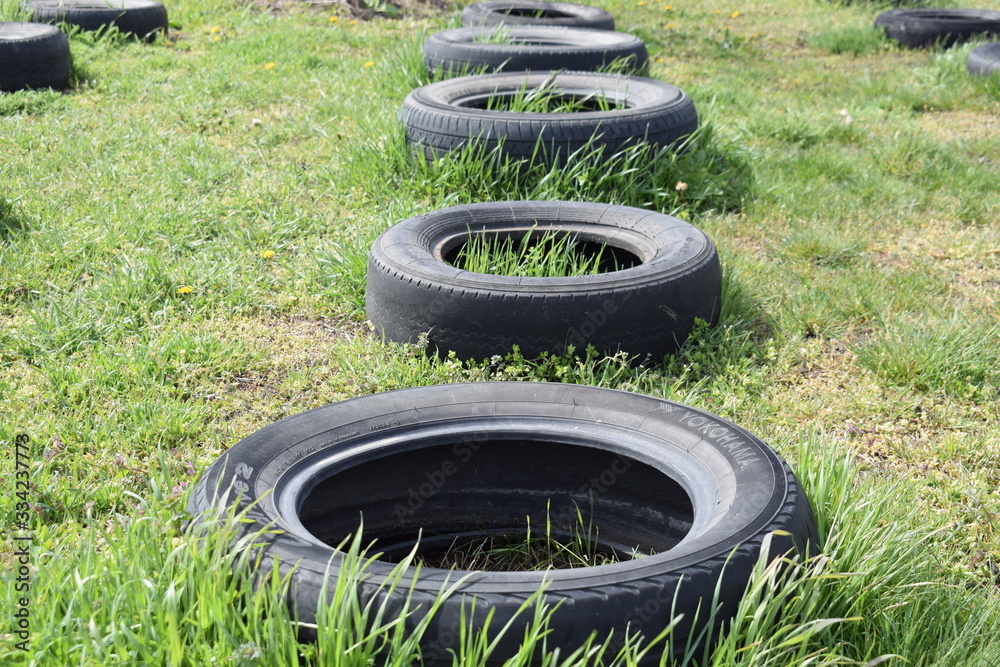 Kherson, Ukraine, 03/26/2020. Stands for evidence in the garden of car tires.