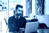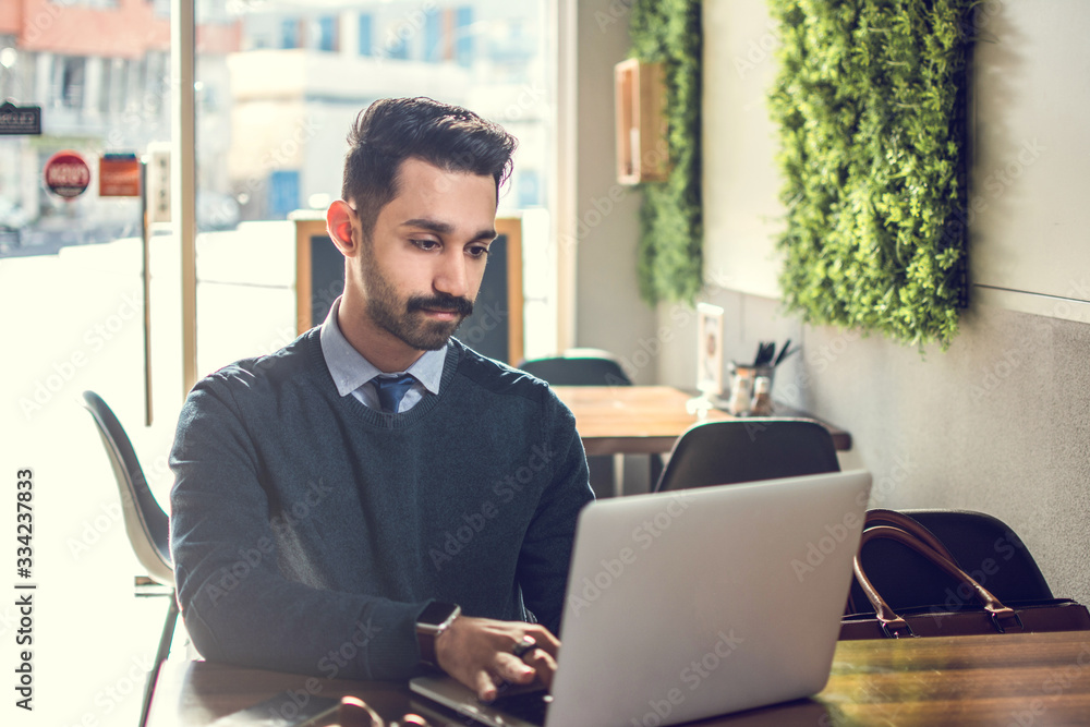 Young handsome Businessman working on laptop in cafe.