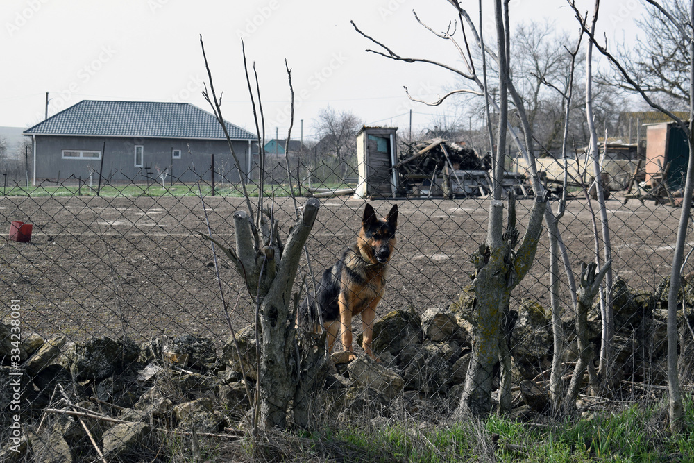 Dog shepherd behind a metal fence and tree branches.
