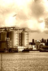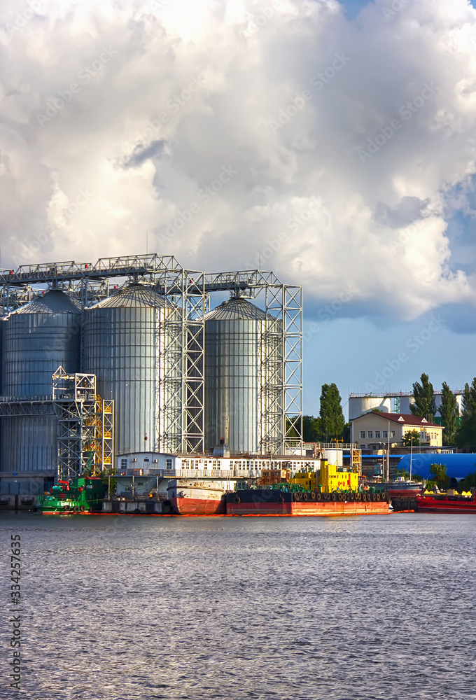 Port terminal. Merchant shipping. Complexes for drying and storing grain. cargo ship. Container terminal for delivery and transportation. Industrial container shipping. Trade Port - Image.